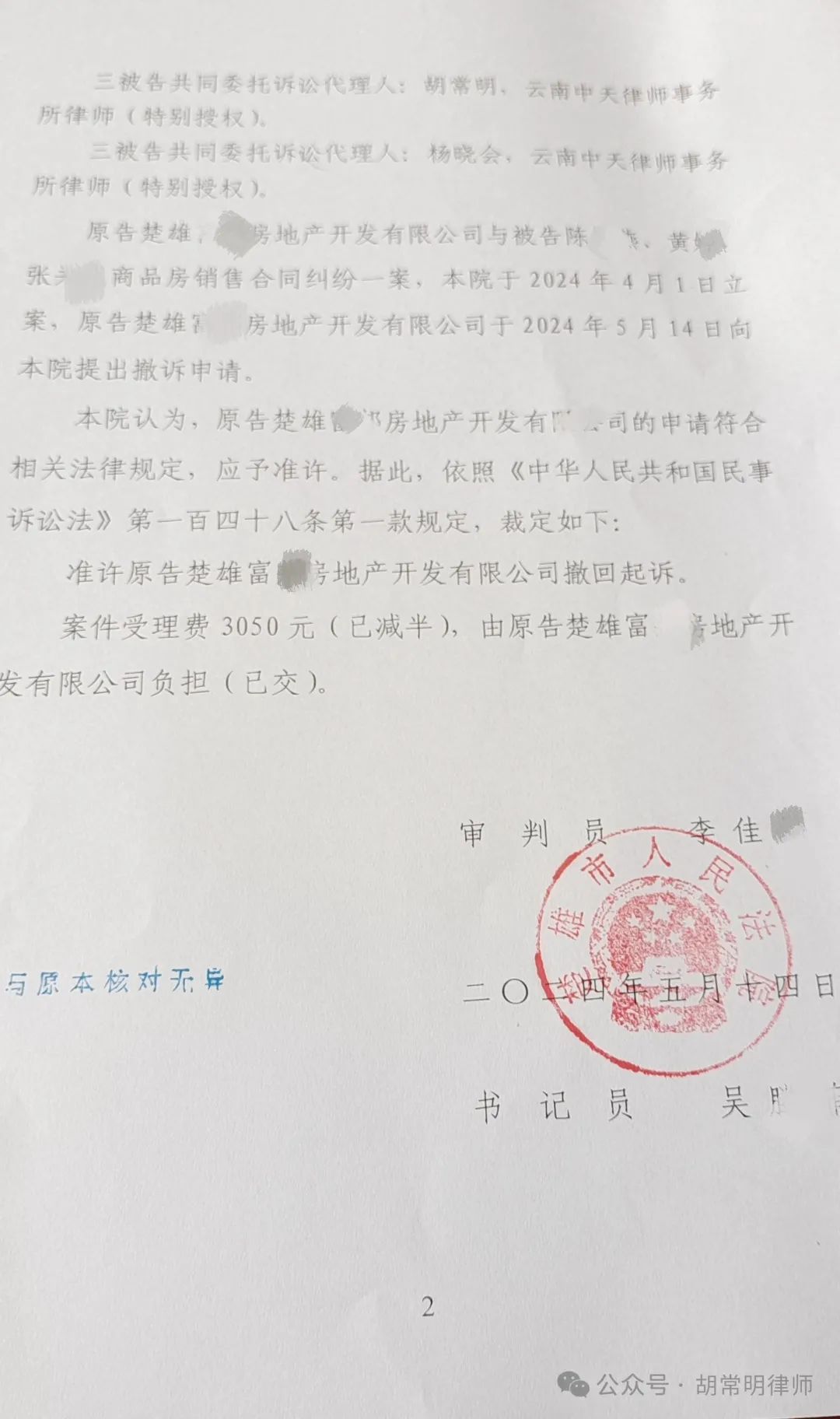 最后,案件承办法官亲自给胡律师来电,称地产公司已提出撤诉,是否将案件了结算了。这是当然,地产公司的“阴谋”未得逞,官司胜诉了,得理还需饶人呀,没有必要再纠缠着不放了。于是楚雄市人民法院做出裁定书,准许原告撤诉,胡律师在外地州代理的这桩案件顺利结束。